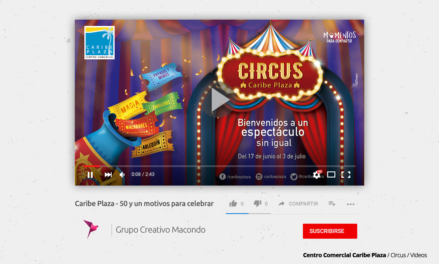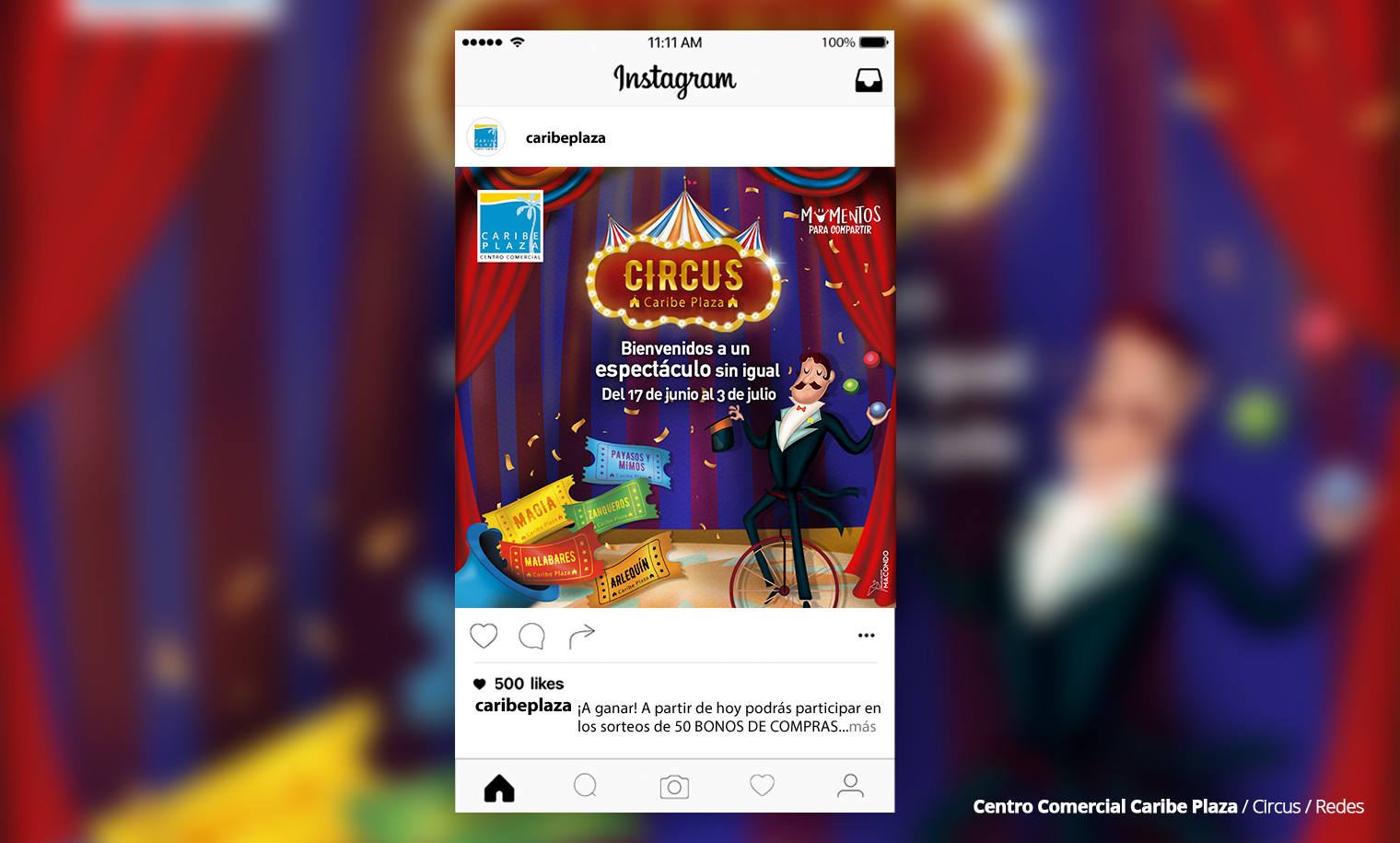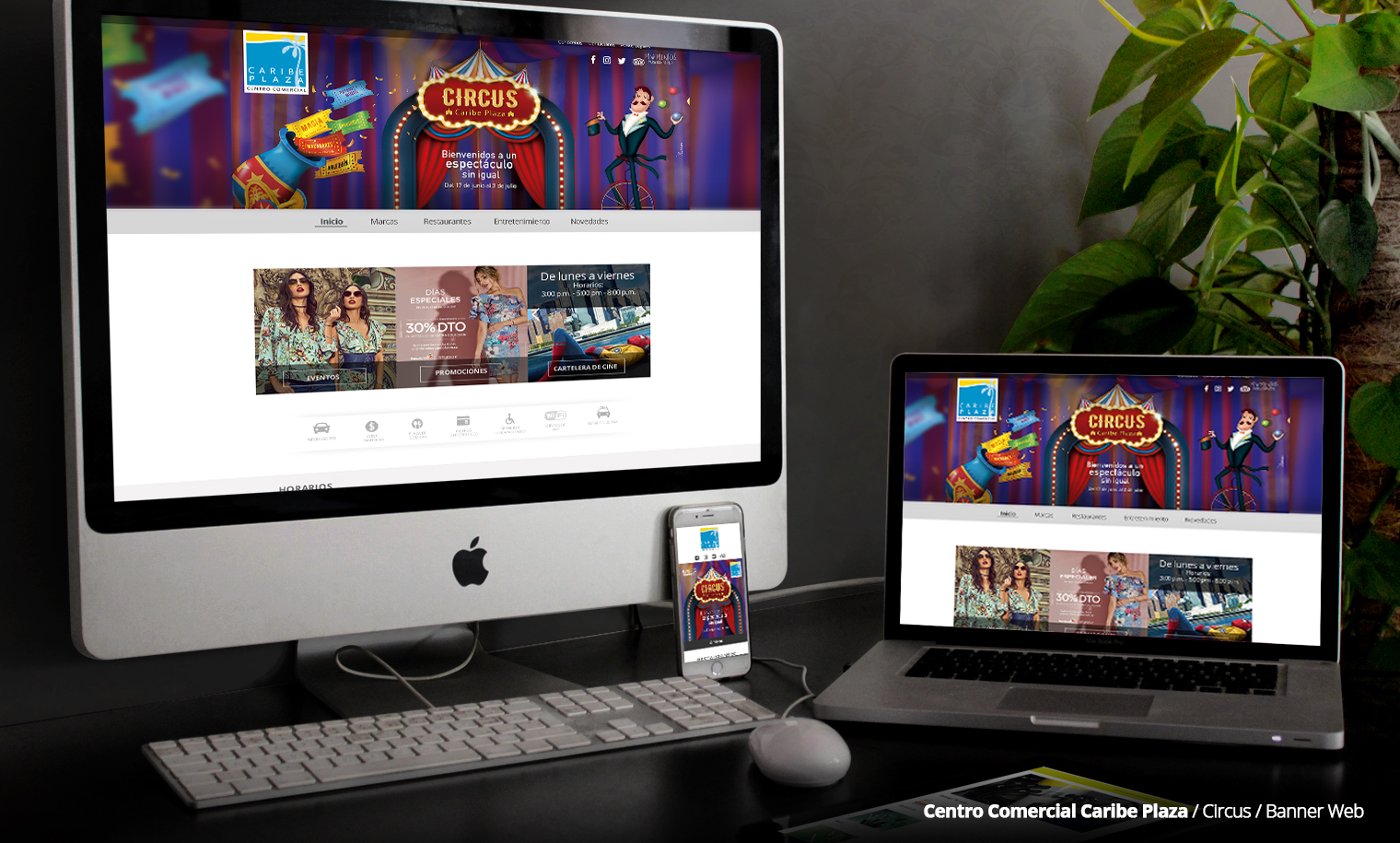 Con el objetivo de posicionar el Centro Comercial Caribe Plaza como la primera opción para los niños en época de vacaciones, establecimos una programación que giraba en torno a un circo. De esta forma mejoramos la interacción de los más pequeños con el entorno del Centro Comercial, dándoles la sensación de estar sumergidos en un espectáculo artístico.